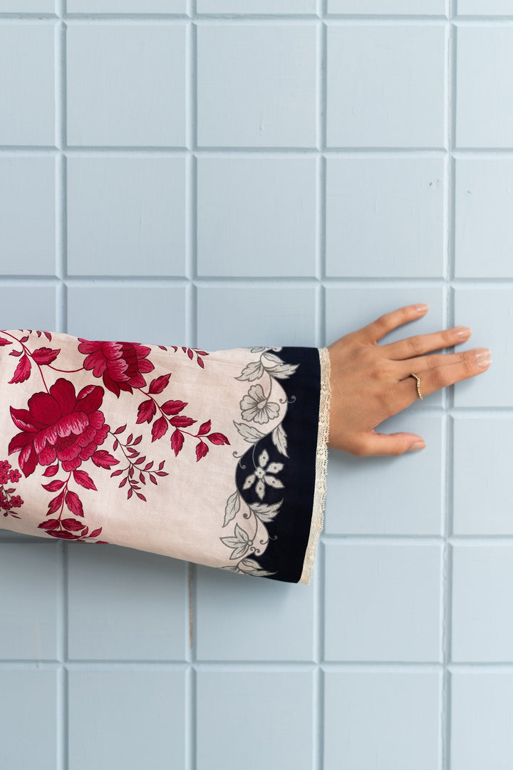 A botanical blue print shirt on an off-white base with all-over floral printed pants, paired with a light chiffon dupatta—fresh, detailed, and full of ease.