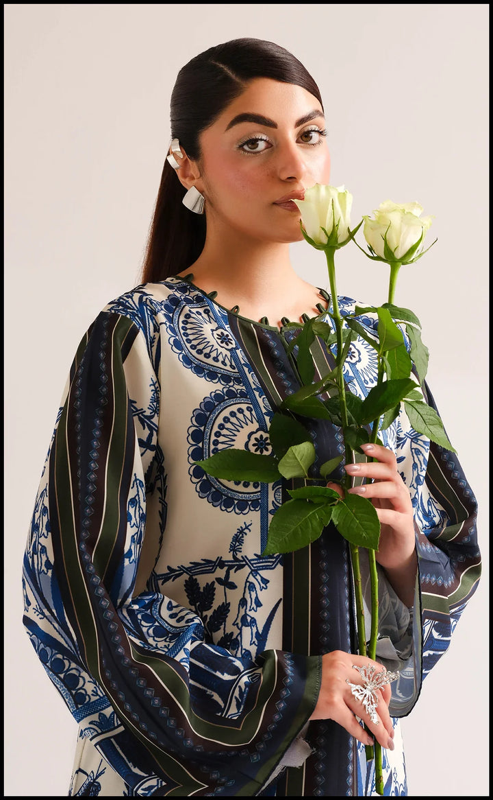 This stunning ensemble features a sophisticated blend of navy blue and white with intricate botanical patterns. The shirt is designed with a flowing, loose silhouette and long bell sleeves, adding an air of elegance and comfort. The matching wide-leg pants continue the floral theme, offering an effortless yet chic look.