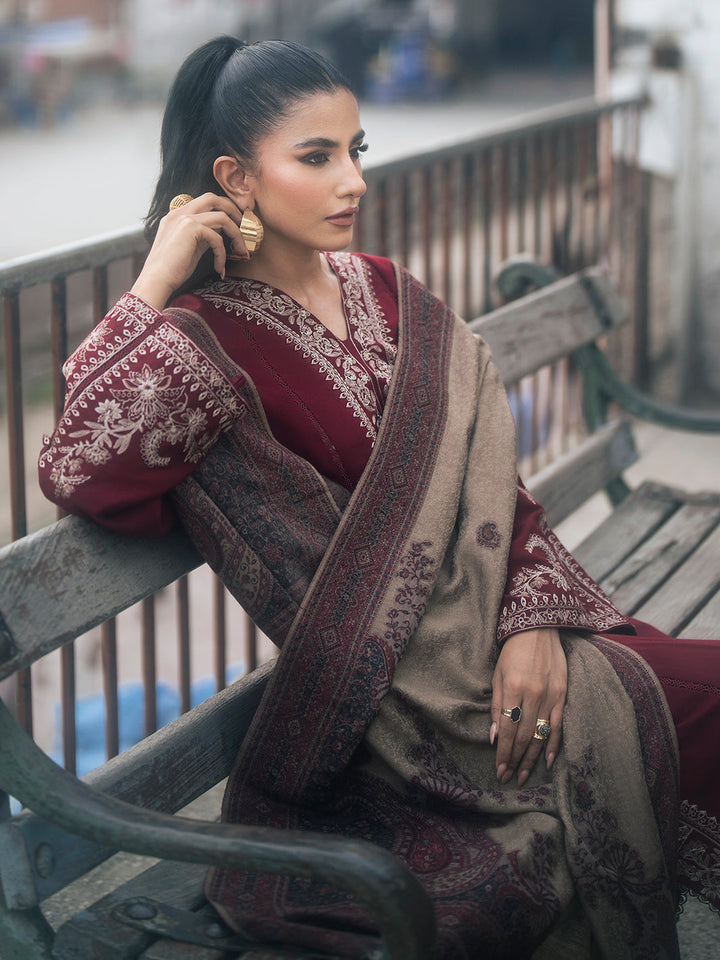 3PC Unstitched DHANAK EMBROIDERED SHIRT WITH COUTRAI PRINTED SHAWL AND TROUSER
